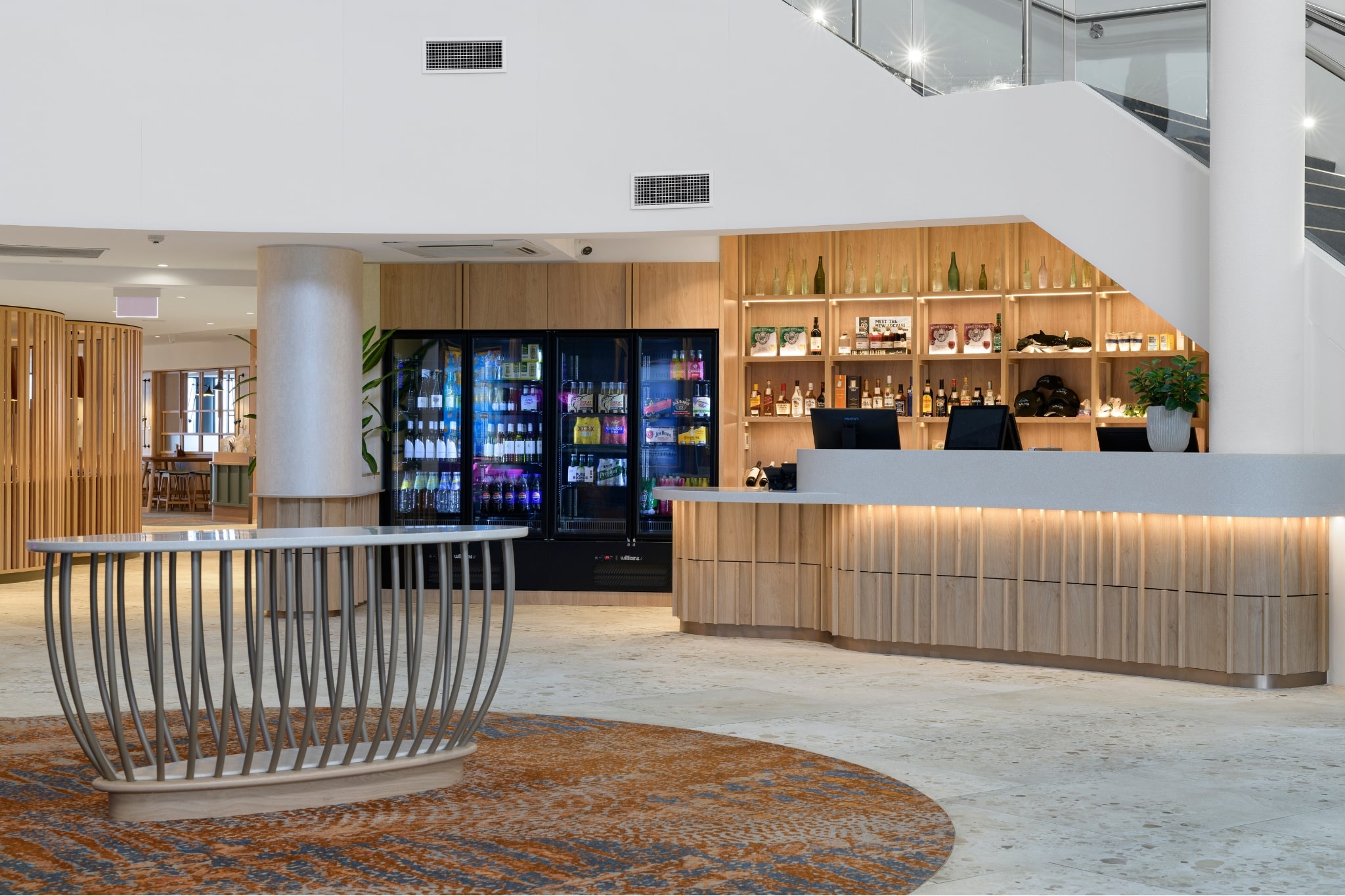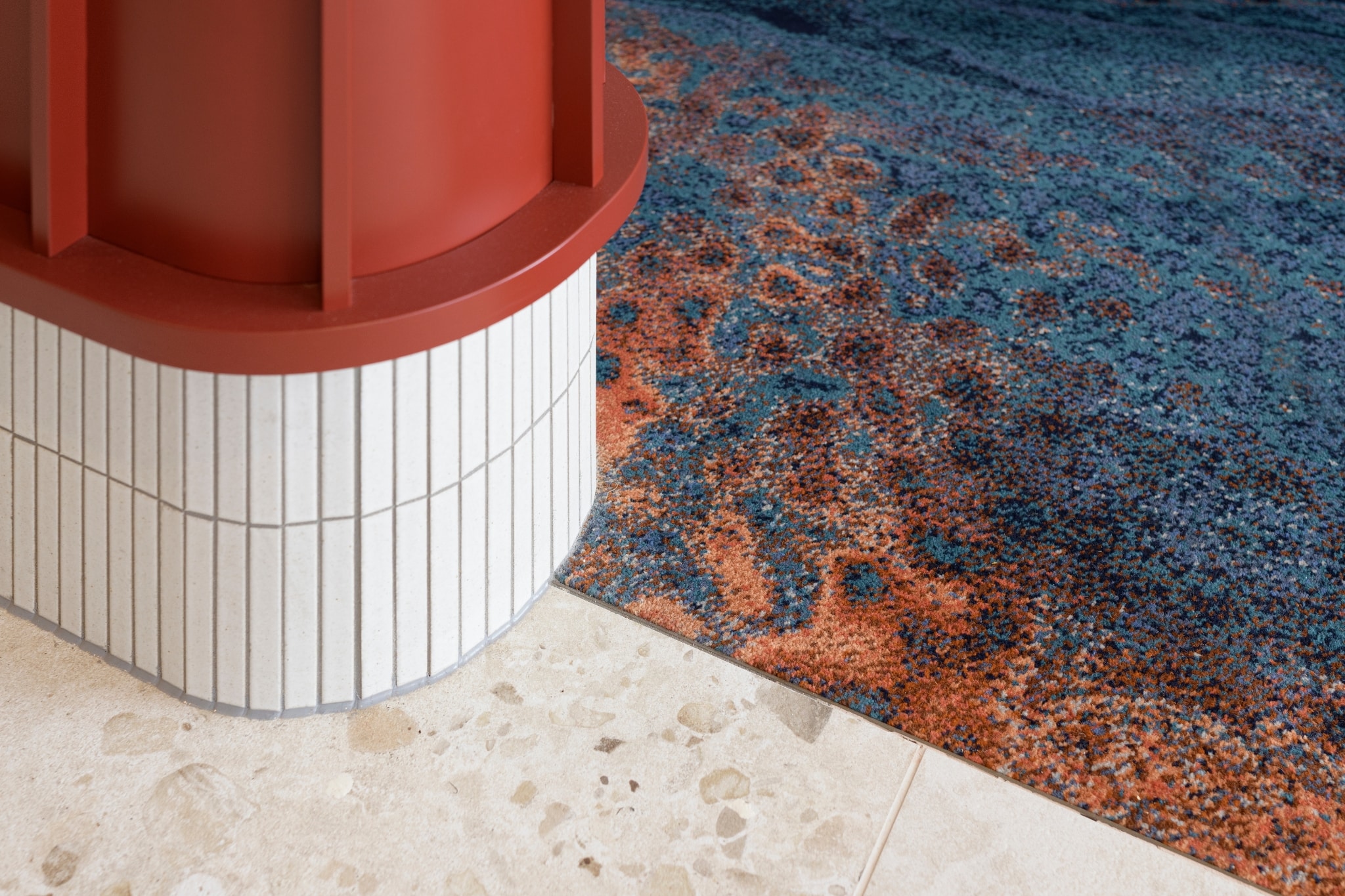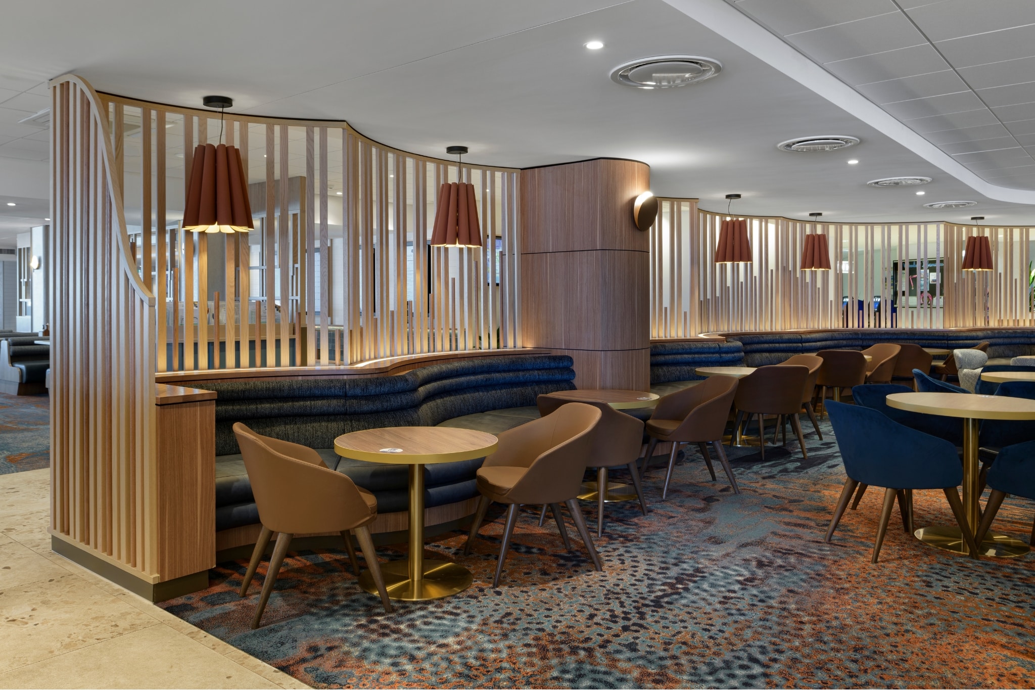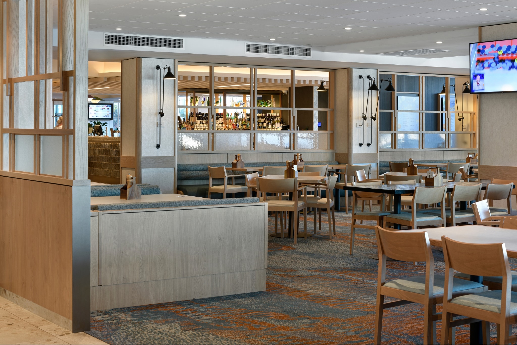 MARINA MEETS MINDFUL DESIGN | A fresh look for the Hervey Bay Boat Club with a complete transformation of the venue, through a multi-stage approach, featuring a new café, sports bar and cocktail lounge. Nestled amongst a coastal Australian landscape, the palette pays homage to the natural beauty of its surrounding environment. Designed in collaboration with the Signature Studio team, the Axminster carpets thoughtfully ground the interior spaces with its earthy, ochre tones in the café to the inky blues featured in the bar, reflecting the transition from inland topography to the ocean in Hervey Bay. Movement and texture were also essential and incorporated through the pattern elements that reflect ripples or currents adding to the overall ambience and feeling of wellbeing.